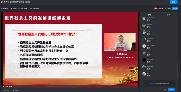 7月10日,44118太阳成城开展“四史”学习教育,学院全体党员线上聆听上海市委党校科学社会主义教研部主任官进胜教授讲述“社会主义发展史”,作“世界社会主义的发展进程与未来”的精彩报告,副院长陈宇飞主持学习活动。