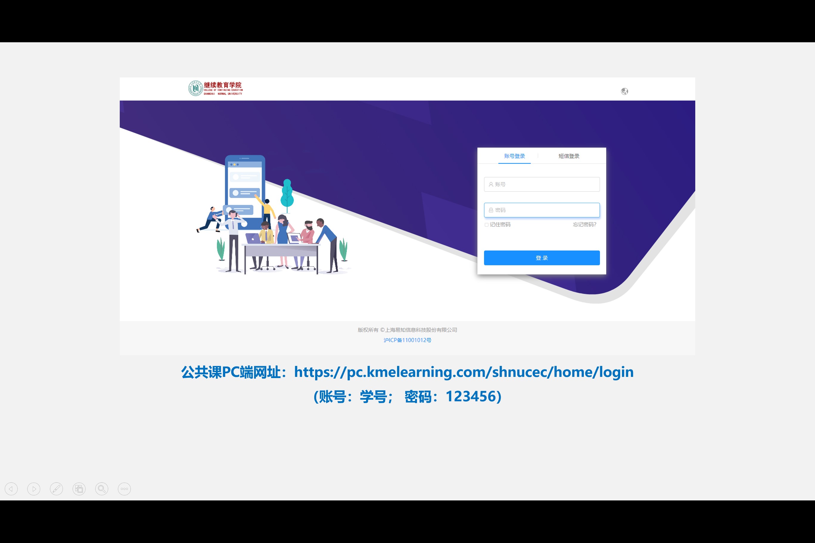 网址:https://pc.kmelearning.com/shnucec/home/login