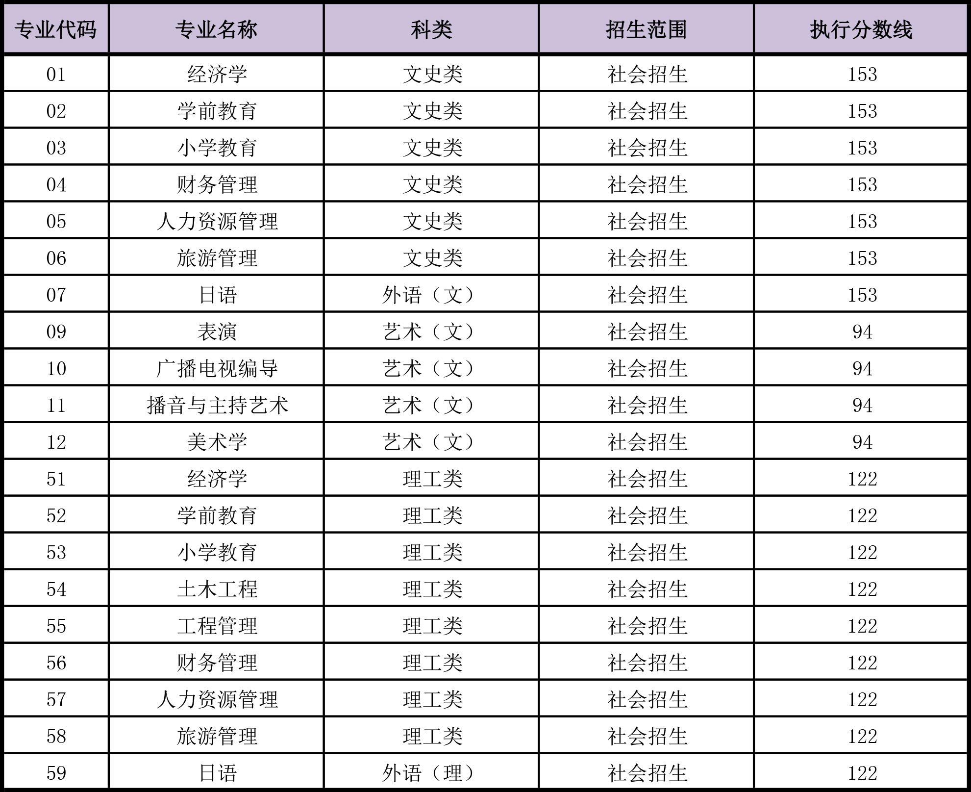 2020年太阳官网成人高等教育招生录取执行分数线