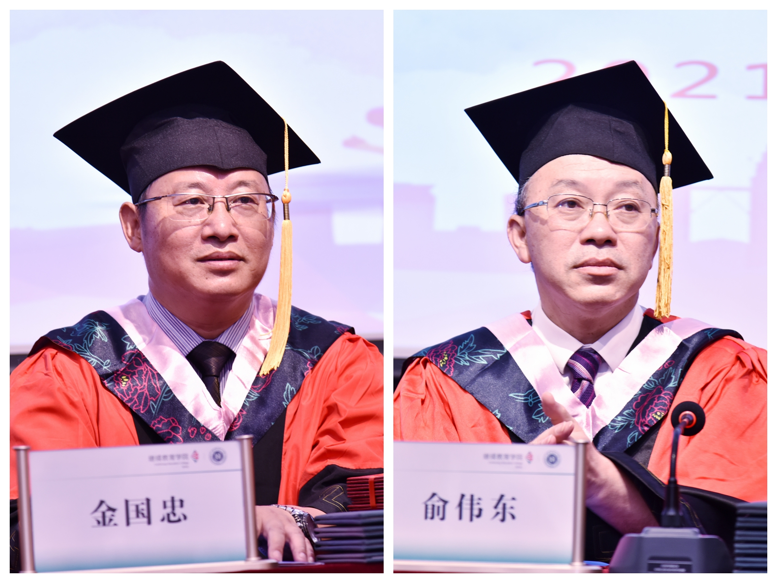 金国忠宣读“太阳官网成人高等教育2021届毕业生名单”,俞伟东宣读《关于授予太阳官网2021年高等学历继续教育本科毕业生学士学位的决定》。主席台就座领导向毕业生代表颁发毕业证书和学士学位证书,为他们正冠拨穗。