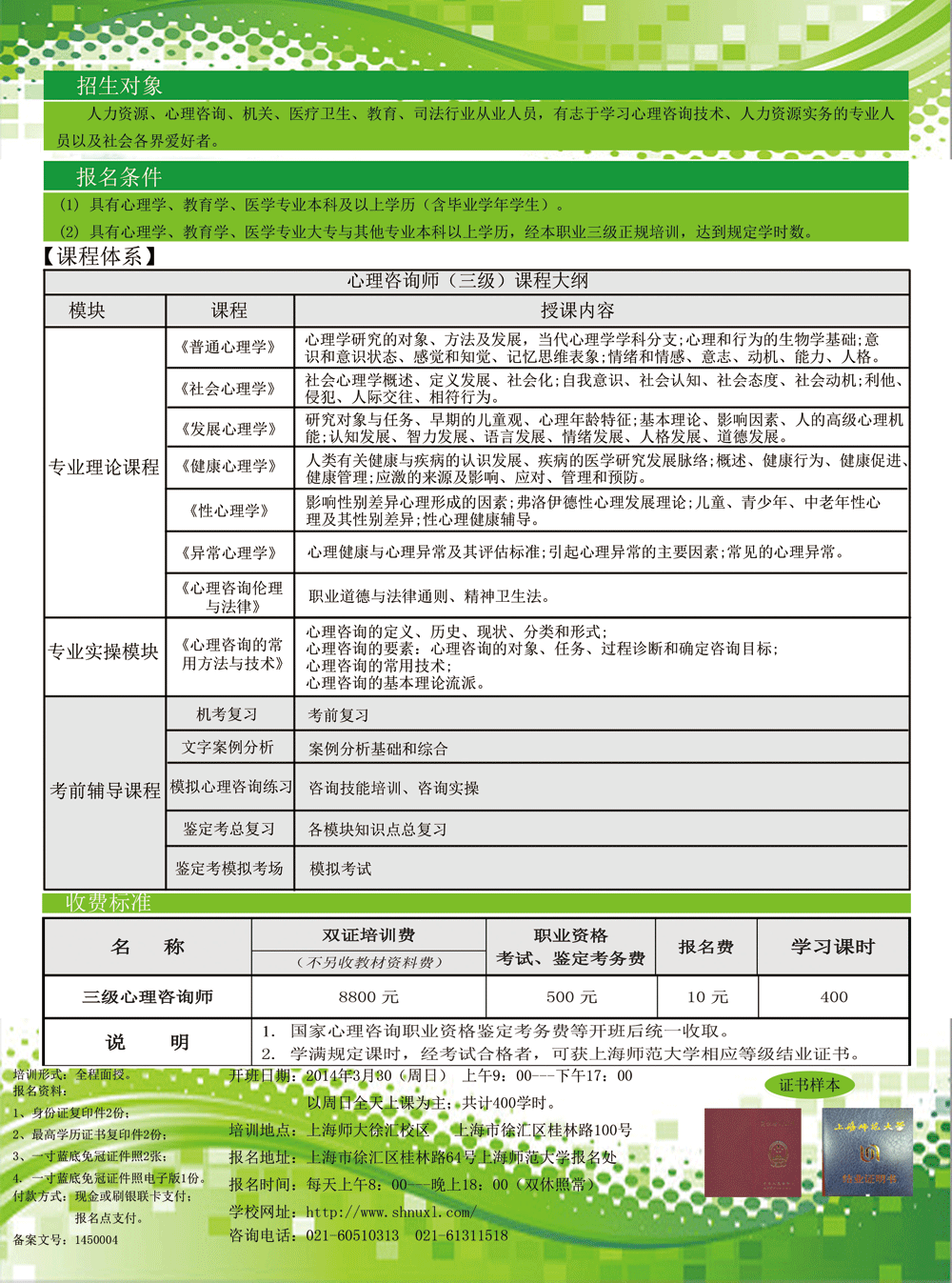2014年3月国家三级心理咨询师双证课程招生简章