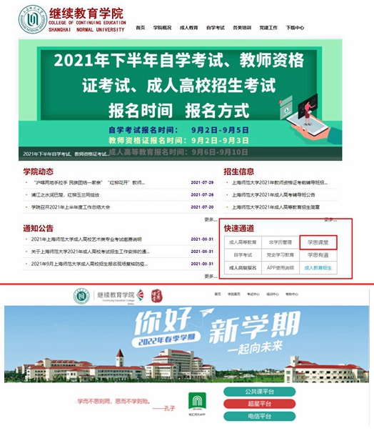 (2)学思课堂(网页端):登录44118太阳成城cec.shnu.edu.cn→选择“快速通道”→点击“学思课堂”→选择学习平台(公共课平台、超星平台、电信平台,点击平台名称下载使用手册)