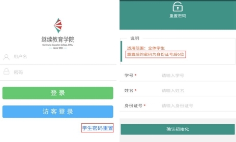(1) 知汇师大APP:在APP登录界面增加“重置密码”功能,学生填写姓名、学号和身份证号,初始化密码,即密码重置为身份证后六位。