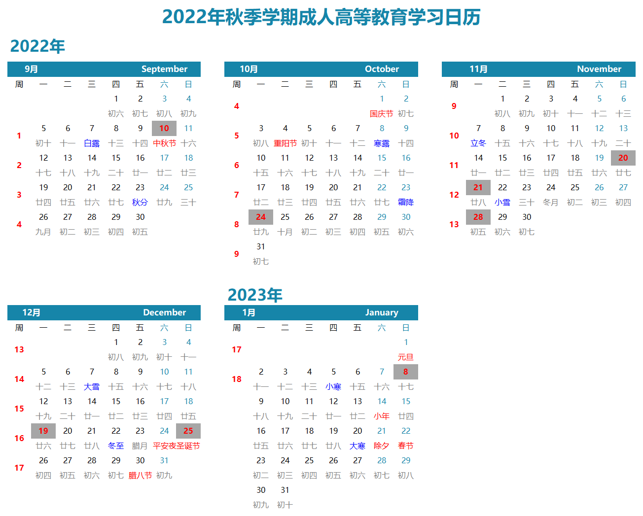 太阳官网成人高等教育2022年秋季学期为2022年9月10日~2023年1月8日(18周),开学上课定于9月10日(周六)。现将相关事宜通知如下: