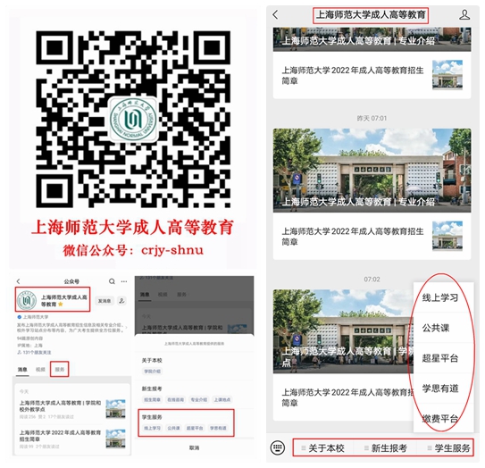 (4) 上海师大智慧校园(微信企业号)或者门户网站:缴纳学费、登录VPN等,关注成人高等教育公众号,进入“学生服务”,点击“信息服务”,查看相关介绍。