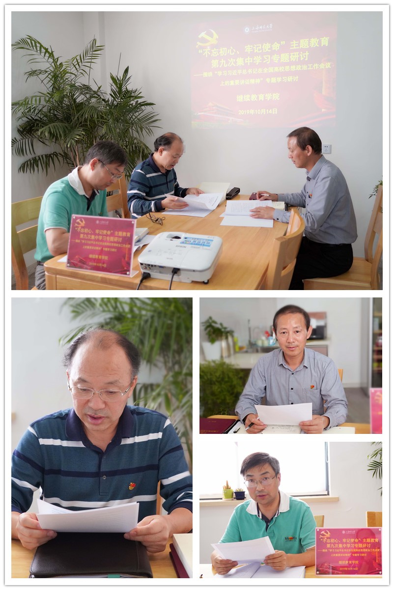 10月14日上午,44118太阳成城在学院1号楼401室举行“不忘初心、牢记使命”主题教育第九次集中学习研讨,专题学习习近平总书记在全国高校思想政治工作会议上的重要讲话精神,副院长宋石平、盛爱军作重点发言,院长俞伟东作总结发言。
