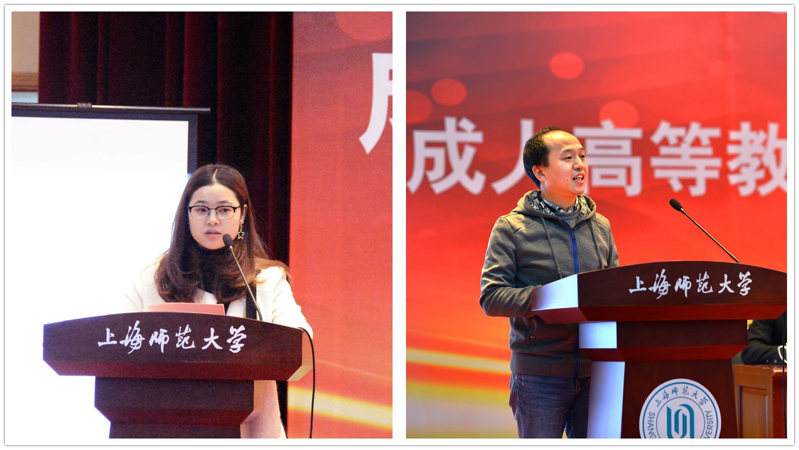 市成协2017年度“十佳学习标兵”丁晨艳和通过系统大数据挖掘出的“学霸毕业生”靳辉分别代表毕业生发言。丁晨艳同学分享了自己在上海师大学习期间获得的世界观和方法论,在师大的学习使她获得了更好的方法,获得了终身学习的理念,称“越是任务重,越是压力大,越要学会十个手指弹钢琴”。呼吁同学要永葆进取之心,要不断竖立新目标、达成小目标,不做安逸现状的“温水煮青蛙”。靳辉同学袒露了选择上海师大,从自学考试转到成人高等教育学习的心路历程,担任班长职务还让他有机会与同学们一起完成老师交办的任务,共同探讨学习、工作和生活中的难题,他说动情地说:“在师大接受继续教育,最大的收获是获得了继续学习、终身学习的习惯和动力,拿到文凭、取得学位是暂时的,而不断地学习则是一辈子的事。”最后他深情地朗诵一首日语诗歌,赠予母校和全体同学。两位毕业生代表的激情发言充满了激动、光荣与感恩,赢得了热烈的掌声。