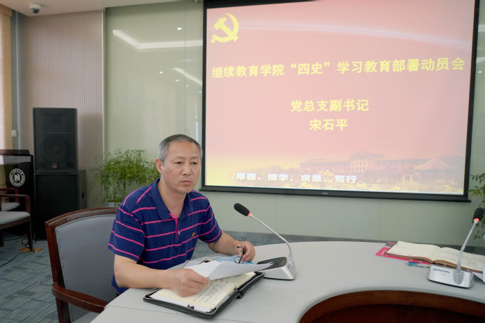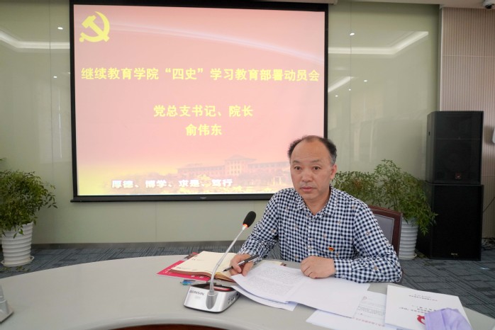 俞伟东同志动员讲话中指出,党史、新中国史、改革开放史、社会主义发展史,是我们党和国家、我们中华民族的宝贵精神财富。用习近平新时代中国特色社会主义思想武装头脑、指导实践、推动工作,把“四史”学习教育作为不忘初心、牢记使命长效机制抓实做好,确保学习教育取得实效。他指出,通过“四史”学习教育,做到不忘历史、不忘初心,知史爱党、知史爱国,做到永葆坚定信念,永葆奋斗精神,永葆为民情怀,永葆担当本色,增强“四个意识”、坚定“四个自信”、做到“两个维护”,始终在思想上政治上行动上同以习近平同志为核心的党中央保持高度一致,做到常怀忧党之心、为党之责、强党之志。最后他要求,全院教职工、尤其是党员和领导干部,要认真学习领会,自觉把思想和行动统一到上级党委的决策部署上来,根据学院党总支“四史”学习教育安排,结合各部门工作实际,认真开展“四史”学习教育,把“四史”学习教育与统筹推进疫情防控、学院中心工作、学校继续教育事业发展结合起来,更好推动学校和学院改革发展。